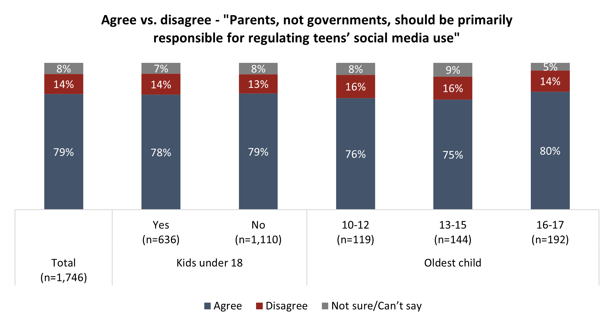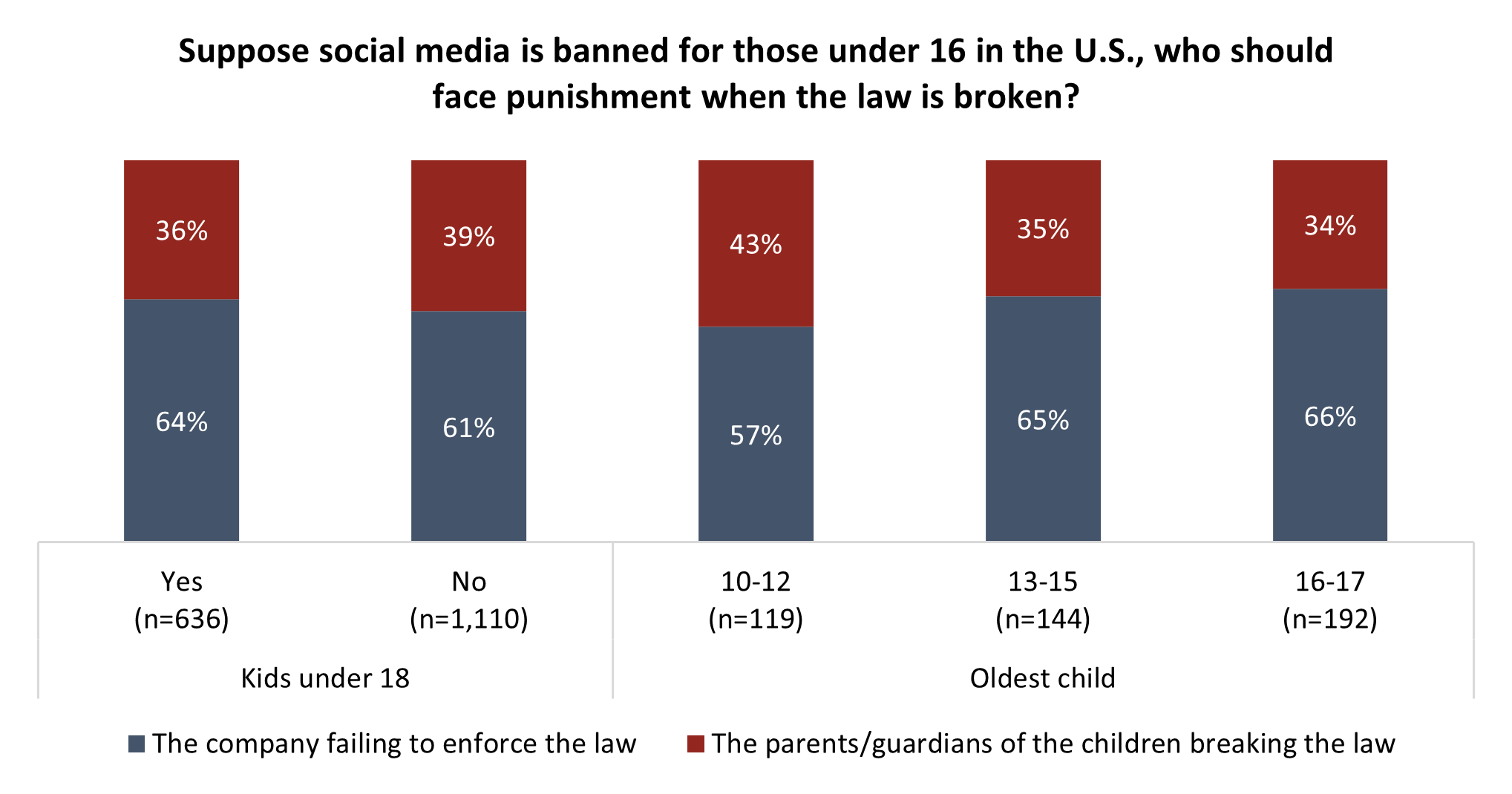 Although a ban would be welcomed by most parents, more say that the responsibility for regulating social media use should fall to the parents (64%) rather than governments (36%).