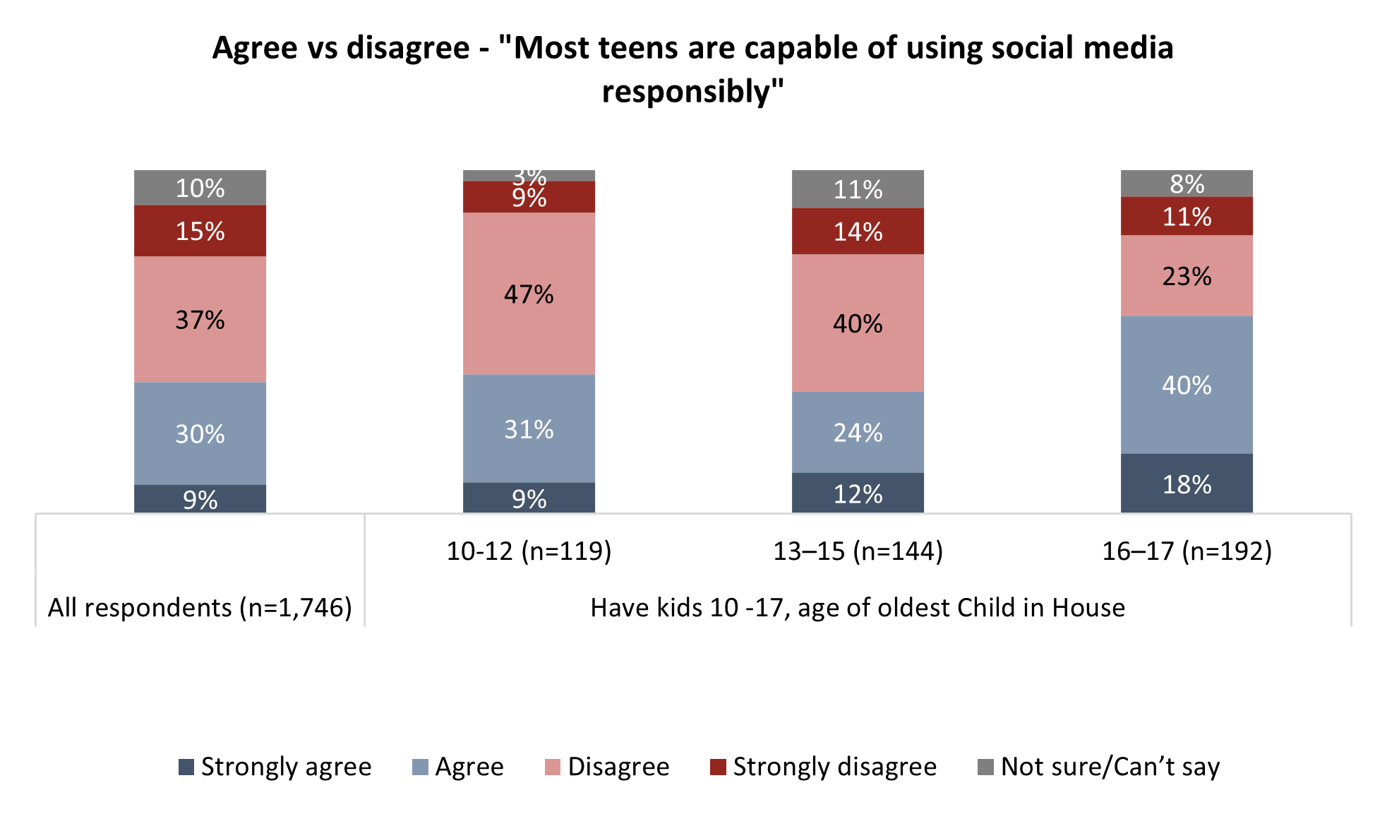 On the broader question of whether or not teenagers are generally capable of using social media responsibly, Americans are relatively divided but more likely to disagree (52%) than agree (39%). Those with children aged 16 or 17 are much more likely than parents of younger children to agree with this statement, though one-third still disagree (34%):