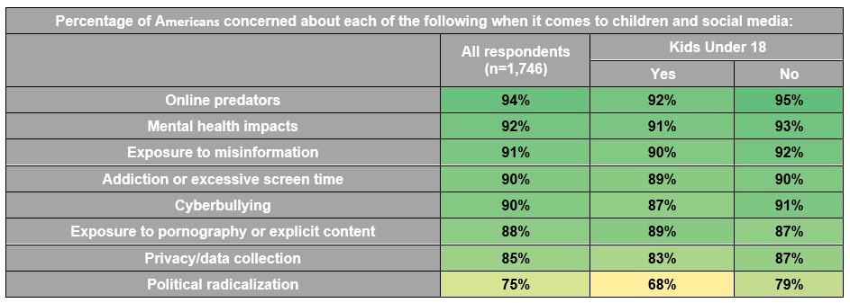 Endorsement of restrictions on the use of social media comes as half (52%) of Americans say they believe teens are not capable of using social media responsibly. Parents of 16- and 17-year-olds are more likely to dissent (68%). However, there is near unanimous concern from Americans over children’s potential exposure on social media to misinformation (91% concerned), cyberbullying (90%), explicit content (88%), negative mental health impacts (92%) and addiction (90%).