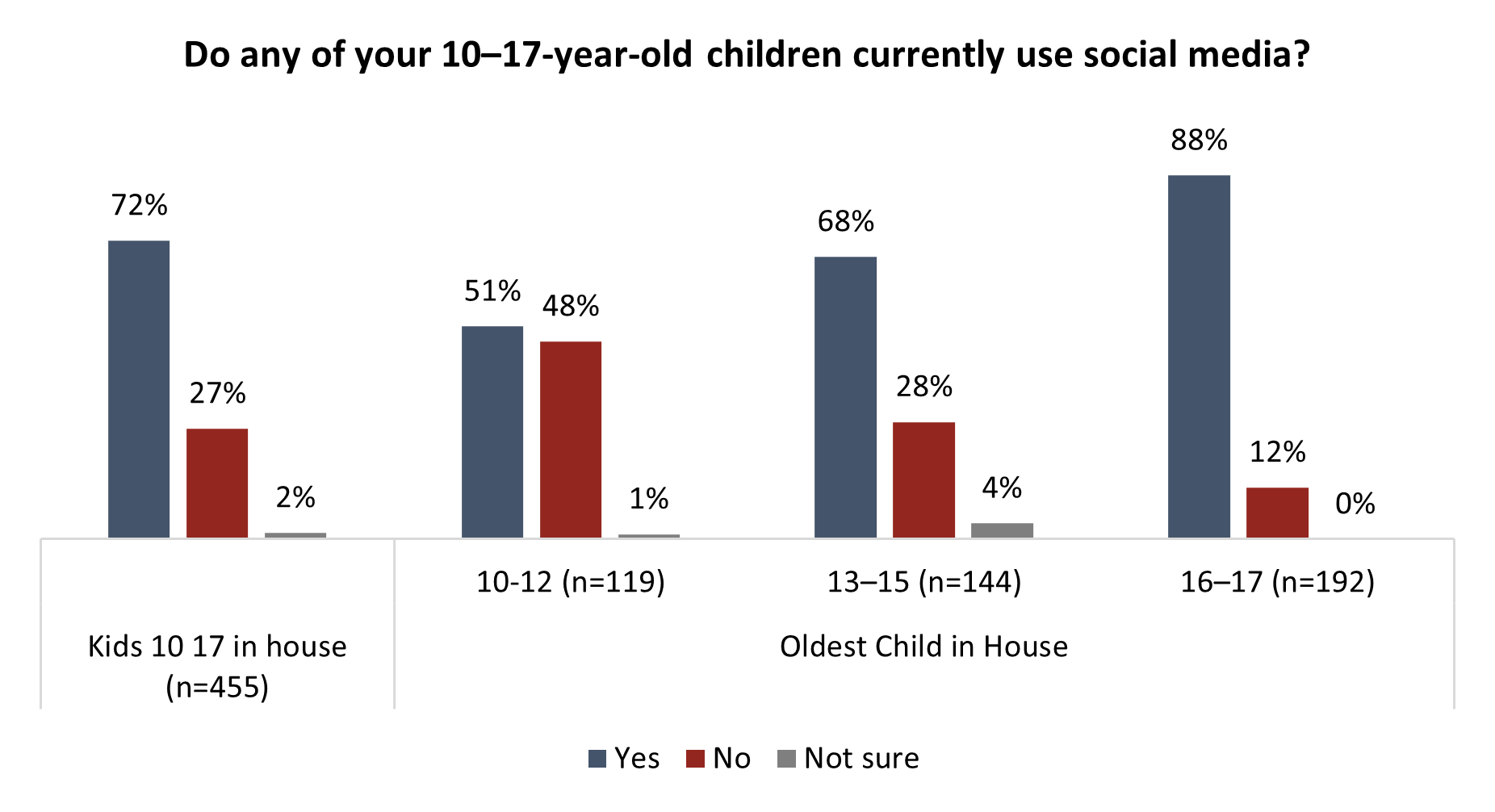 Among those parents in the survey with kids aged 10 to 17, approaching three-quarters (72%) say that their child(ren) currently uses social media. Notably, those whose oldest child is in the 10 to 12 range are split evenly over current usage: