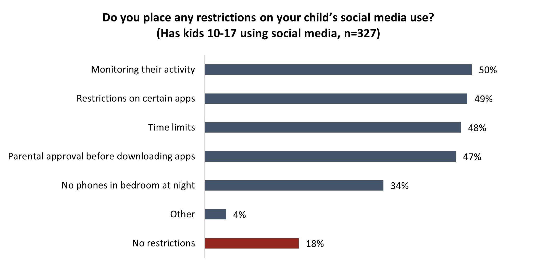 As it stands, parents with kids aged 10 to 15 are more likely than not governing their kid’s social media use. A majority say they put restrictions on which apps their kids use, monitor their activity or place time limits.