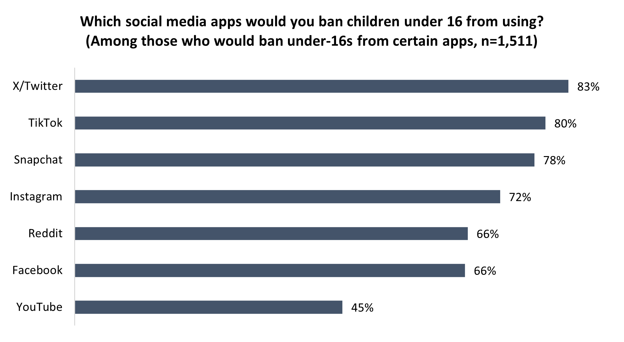 - When those who want under-16s banned only from certain apps are asked which social media should be verboten, X/Twitter (83%), TikTok (80%), and Snapchat (78%) are at the top of the list. Fewer than half (45%) would ban kids under 16 from YouTube.