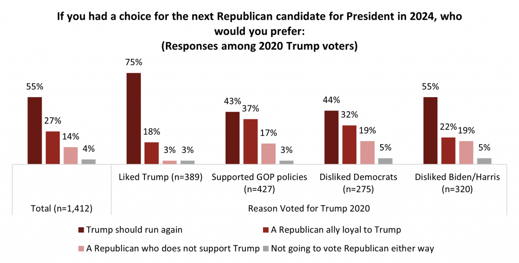 Asked why they supported the Trump-Pence ticket in 2020, GOP voters fall into four distinct camps based on personality and policies. About a quarter point to admiration for Trump as their number one reason for voting Republican. A slightly larger segment (30%) chose support for GOP policies as their primary motivation. The rest say their vote was driven by a dislike for the policies of the Democrats or disdain for Biden-Harris leadership.