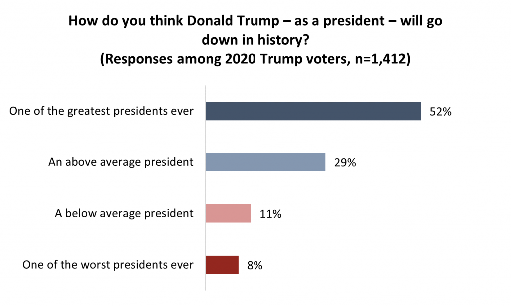 - Asked to judge Trump’s legacy, just over half (52%) of 2020 Republican voters proclaim he was one of the “greatest presidents ever” while nearly one-third (29%) say he was “above average”; one-in-ten (8%) dismiss him as one of the “worst presidents ever” while nevertheless voting GOP.