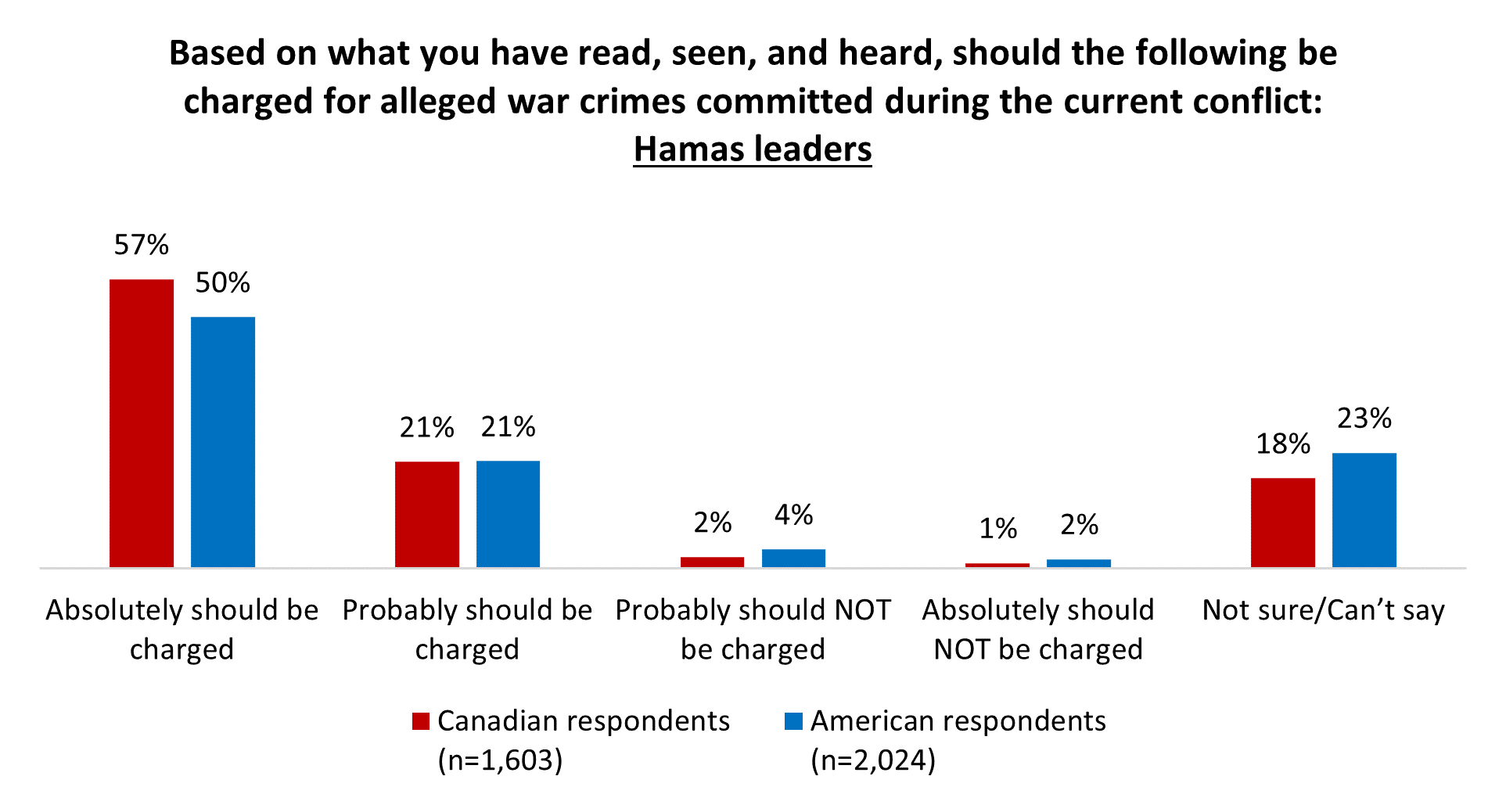 Respondents were asked based on what they have read, seen, or heard, whether they feel they would charge the Israeli or Hamas leadership with war crimes, as the ICC recently filed. Broad agreement exists that Hamas leaders should be charged.