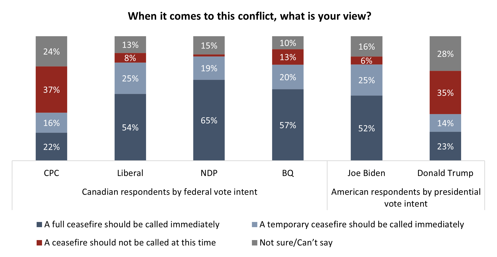 Canadians and Americans who say they would support right-of-centre options on the ballot if elections were held today in their respective countries are more divided on the issue than other likely voters. Nearly as many likely CPC voters believe a ceasefire should be called (38%) as not (37%); similarly, equal sized proportions of those who would vote for former U.S. President Donald Trump believe it is time for the fighting to stop (37%) as not (35%):
