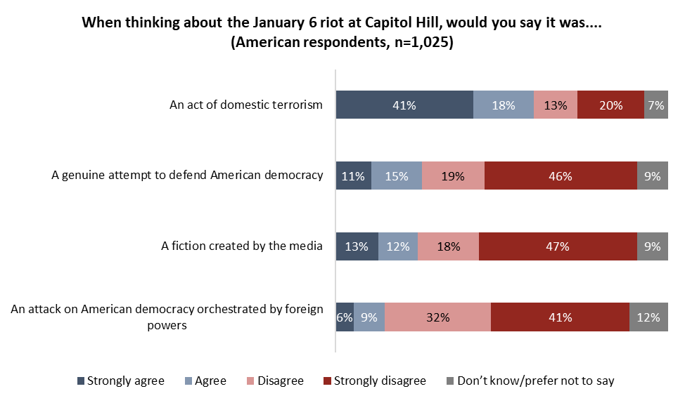 - One-quarter of Americans (26%) believe the rioters’ cause was a genuine attempt to defend democracy, while one-quarter (25%) believe the event was fiction and created by the media. Fewer (15%) believe it was an attack on American democracy orchestrated by foreign powers.
