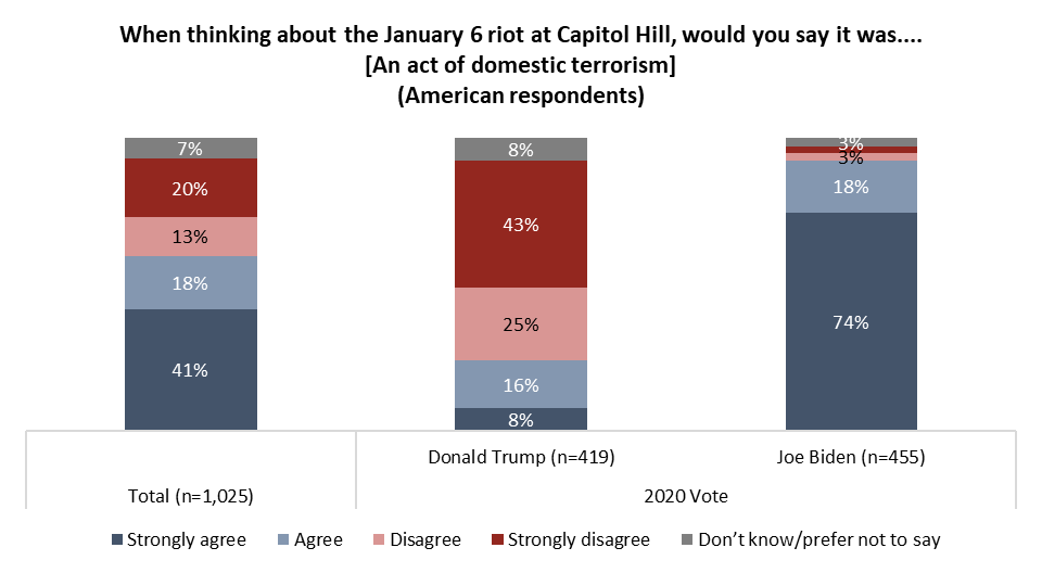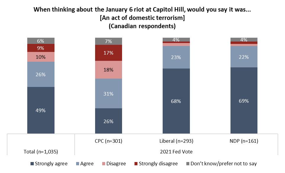 In Canada, 35 per cent of past Conservative voters disagree with calling the events an act of domestic terrorism, while a handful of NDP (5%) and Liberal (5%) voters take this view.