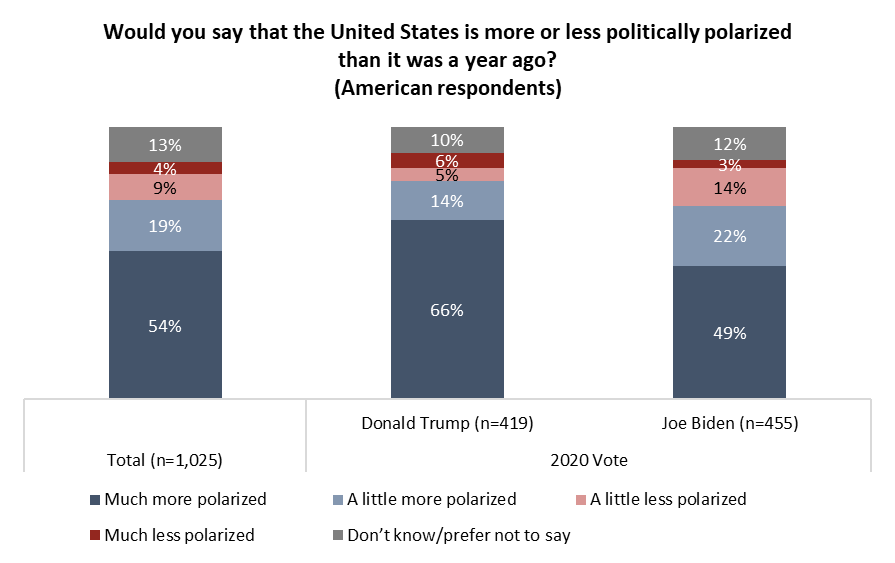 While there are differences in opinion across political lines in the U.S. in how to characterize what happened on Jan. 6, there is more agreement on its effect. Four-in-five (80%) of those who voted for Trump in 2020 and seven-in-ten (71%) of those who voted for Biden believe politics have become more polarized in the intervening year: