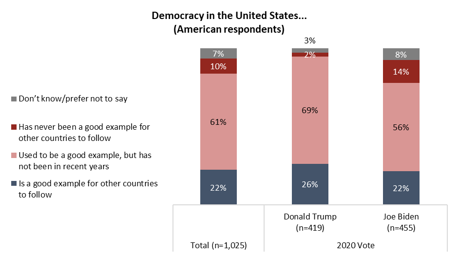Although those who voted for Trump in the last election are the most likely to say that democracy in the United States is a good example for other countries to follow at one quarter (26%), there remains significant disagreement over the results of the last election. Two-in-five (41%) who voted for Trump responded that he definitely won the last presidential election, while another third (32%) say that he probably won. A significant minority of Trump voters, one-fifth (20%), believe Biden definitely or probably won. By contrast, 2020 Biden voters are near-unanimous in their view of how the election turned out: