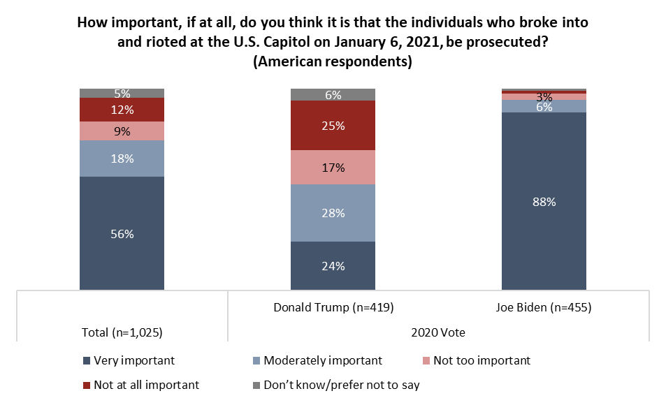 - Three-quarters (74%) of Americans believe it’s important to prosecute those who broke into the U.S. Capitol on Jan. 6. Nearly all (94%) of those who voted for Biden in 2020 agree. Fewer, but still half (53%), of those who voted for Trump believe authorities should punish those who rioted.