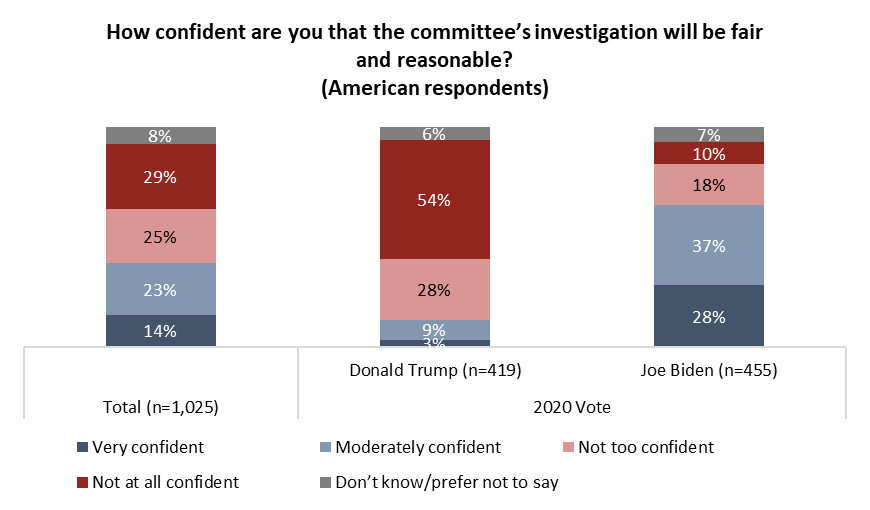 More than half of Americans (54%) lack confidence that the committee’s investigation will be fair and reasonable. Perhaps in light of the lack of Republican representation on the committee, those who voted for Trump in 2020 are much less likely to show confidence in its investigation: