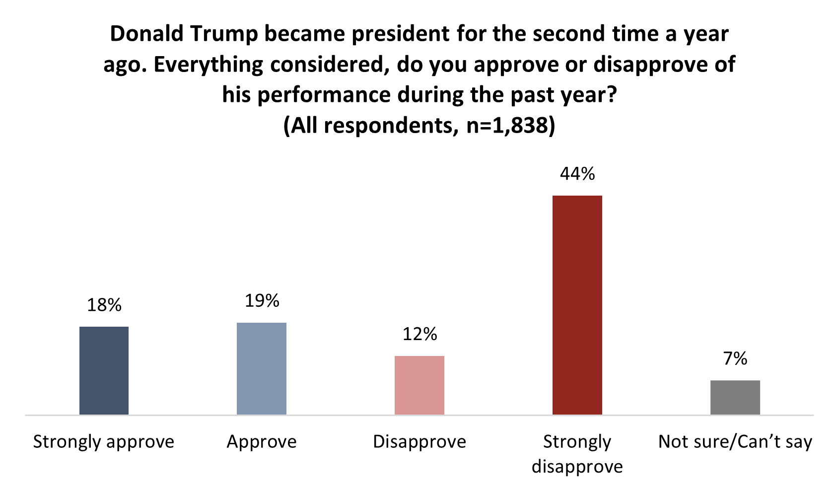 Americans offer more criticism than praise for Trump after the first year of his second term. A majority (56%) say they disapprove of his performance over the past 365 days, while fewer than two-in-five (37%) say they approve so far: