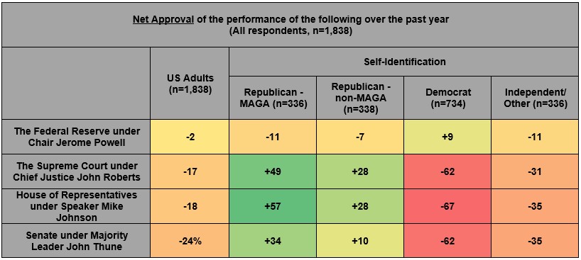 Democrats are driving much of the negativity toward the Supreme Court, the House and the Senate. The Federal Reserve receives more praise than criticism from this group. Non-MAGA Republican are generally approving of those institutions, less so than their MAGA-aligned compatriots. Most offer slight criticism of the Fed.