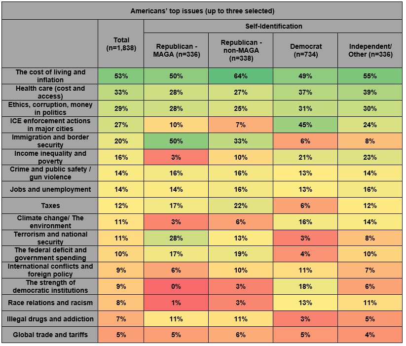 Immigration falls behind the cost of living for non-MAGA Republicans, although it is still their second-most chosen issue. Health care access and political corruption also rank in non-MAGA Republicans’ top five.