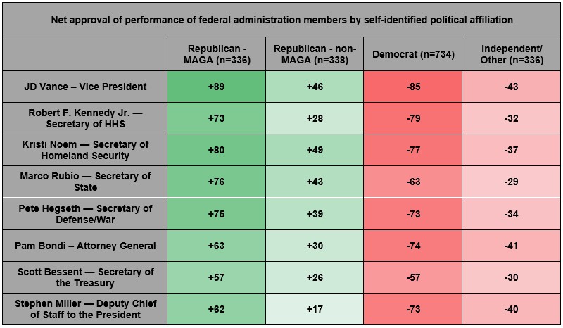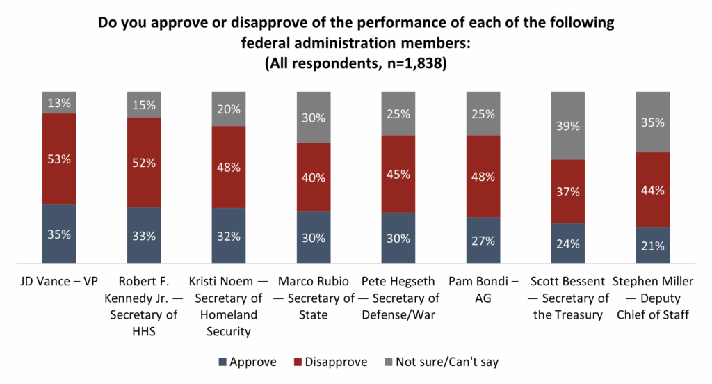- Vice President JD Vance garners the highest level of approval among major administration members, at 35 percent. Deputy Chief of Staff Stephen Miller fares worst at 21 percent