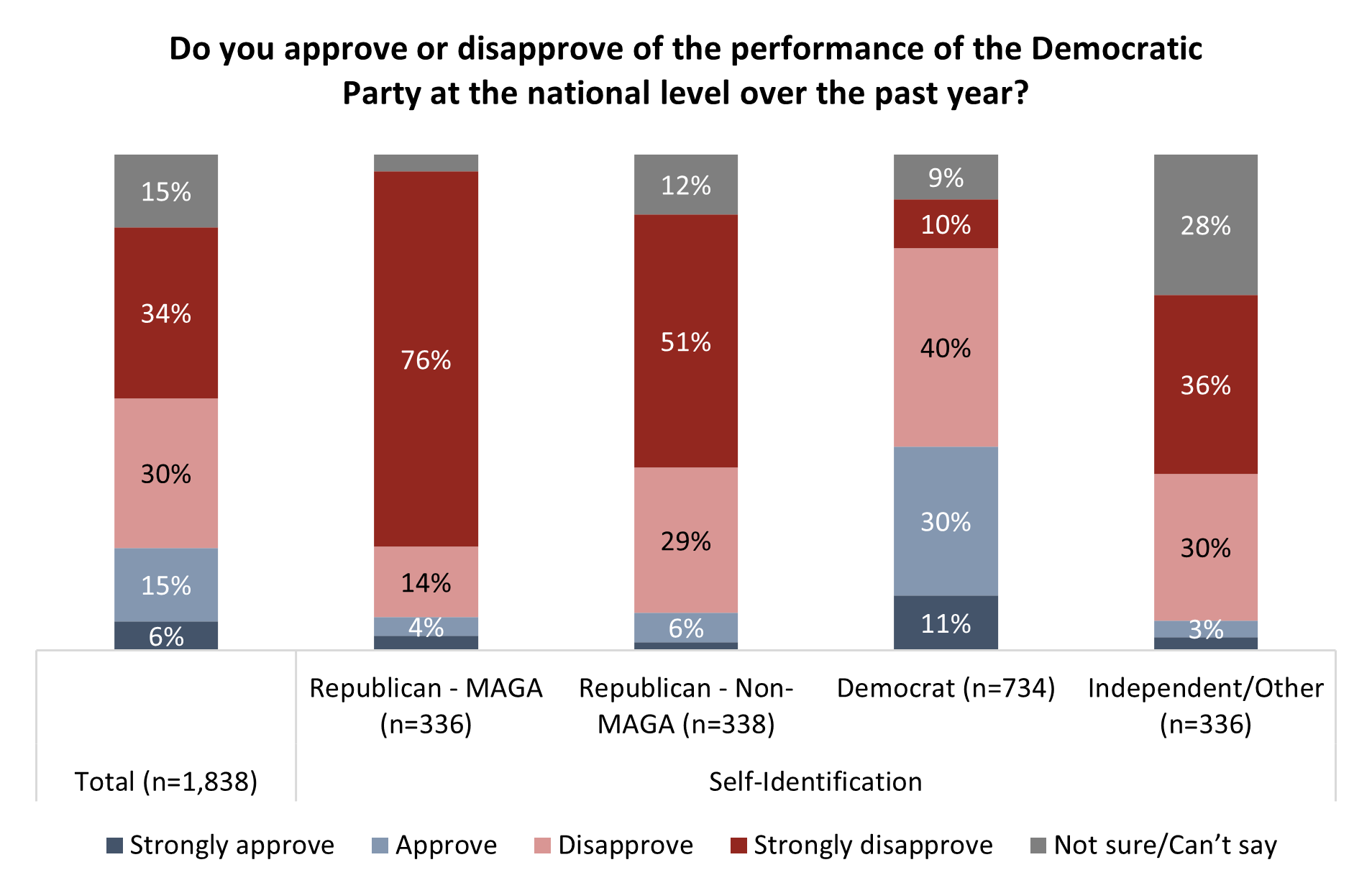 - Trump’s approval: MAGA Republicans – 93%, non-MAGA Republicans – 69%, Democrats – 6%, Independents/Other – 18%