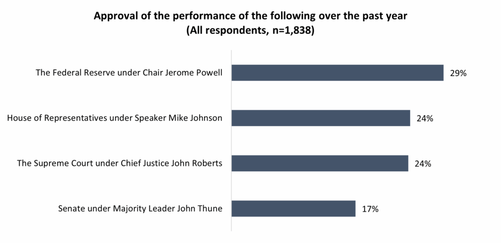 - The Senate (17%), the House of Representatives (22%) and the Supreme Court (24%) all have poor approval levels
