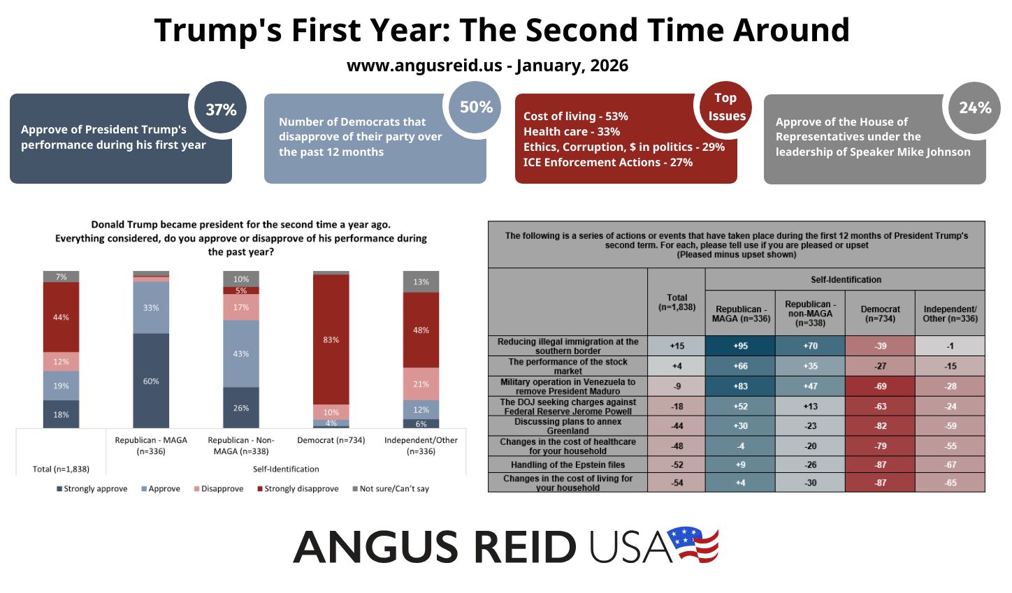 January 22, 2026 – The impacts of U.S. President Donald Trump’s first year of his current term appear to be creating serious fissures between MAGA and non-MAGA Republican voters.