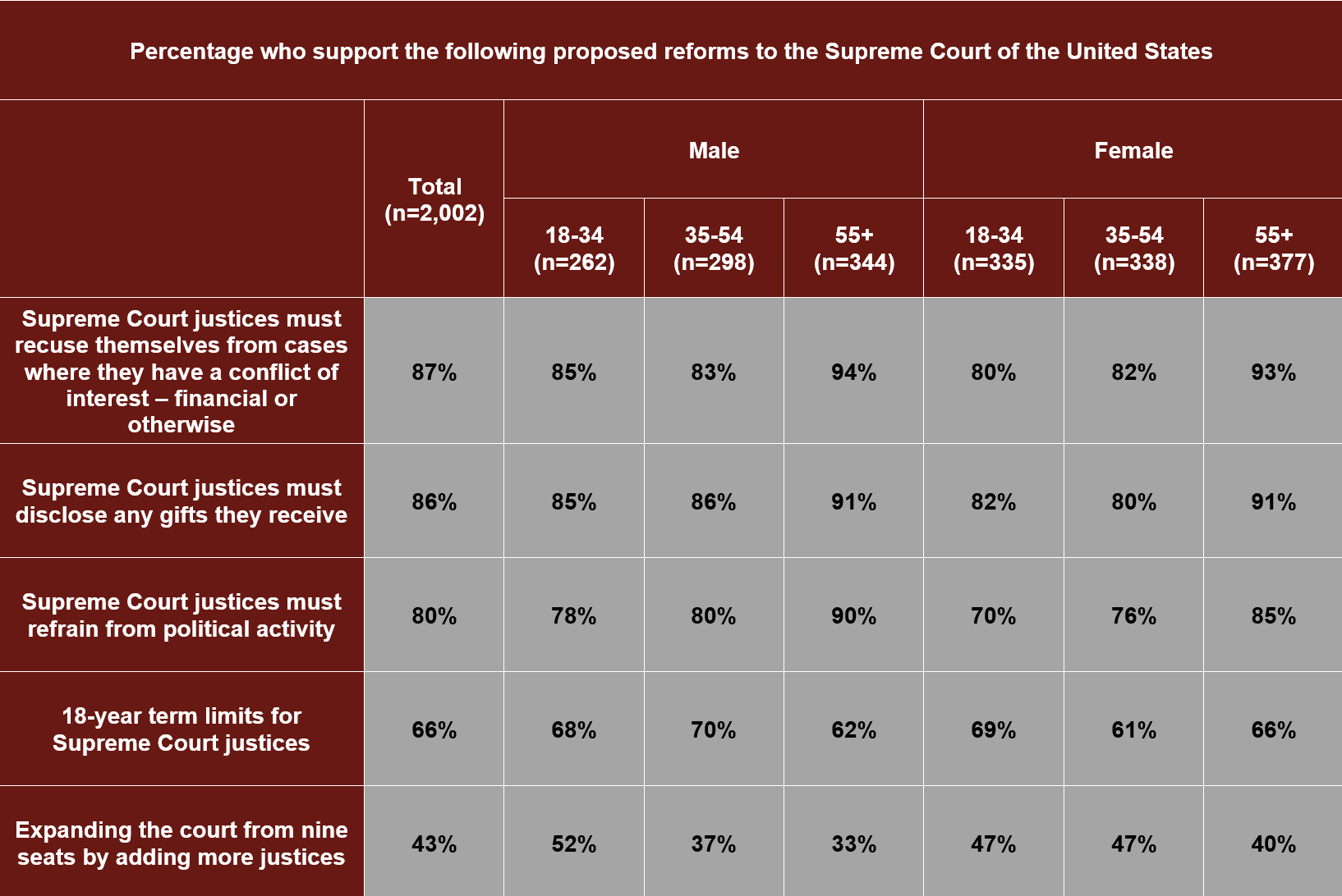 Overall, there is broad support for rules on political activity (80%), gift disclosure (86%) and conflicts of interest (87%). Two-thirds (66%) also support an 18-year term limit for Supreme Court justices.