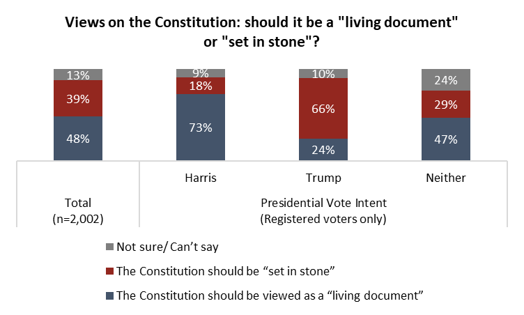 Views on the Constitution and its interpretation fall along political lines. Three-quarters of likely Harris voters believe the Constitution is a “living document”, while two-thirds (66%) of those who intend to support Trump believe it should be “set in stone”: