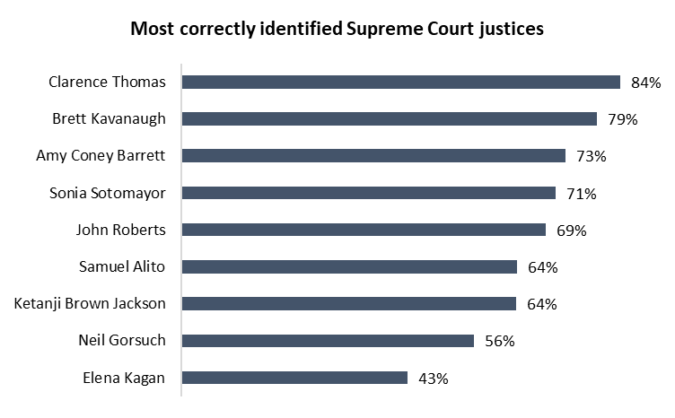 The Supreme Court has become a regular topic of conversation given its recent controversial and impactful rulings, and given the scandals embroiling some of its justices. When presented with a randomized list of six names, including the names of three current Supreme Court justices and three decoy names, a majority of Americans can correctly identify at least two justices. Older Americans are more likely to correctly recognize the names of justices than younger ones: