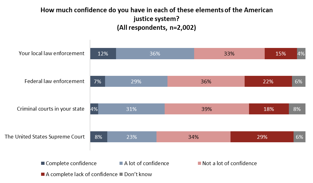 As the dust settles on these pivotal decisions, Americans are more likely than not to lack confidence in various elements of the justice system. On local law enforcement, Americans are split between expressing confidence (48%) and doubt (48%). Otherwise, a majority say they have “not a lot” or “a complete lack of confidence” in federal law enforcement (58%), criminal courts in their state (58%) and the Supreme Court (64%), the latter of which fares the worst by this metric:
