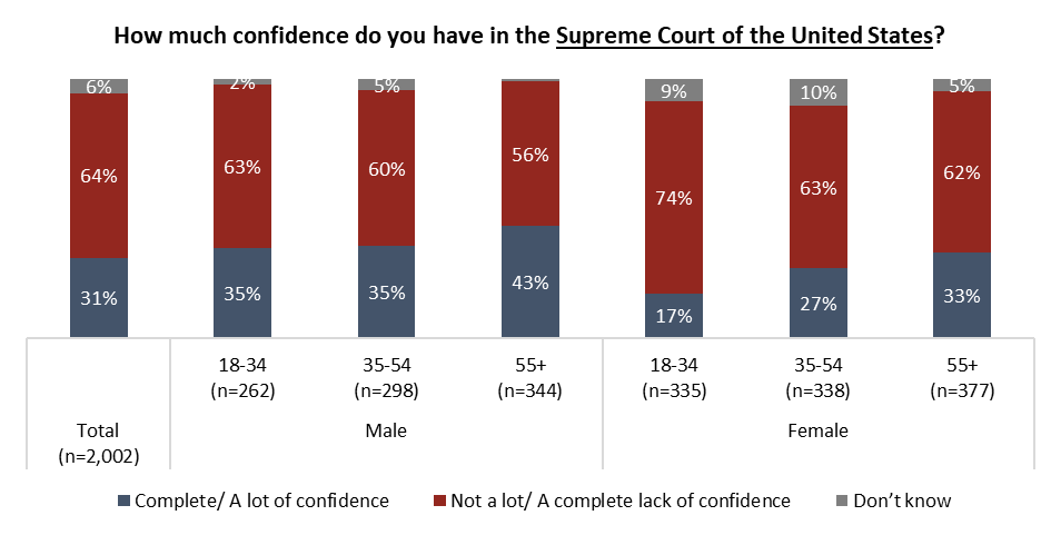 Focusing specifically on the Supreme Court, a majority of all demographics say they lack confidence in the highest court in the country. Men older than 54 (43%) are the most likely to say they have “complete” or “a lot of confidence” in the Supreme Court, while women aged 18- to 34-years-old (17%) are the least likely. For women that age, the overturning of Roe v. Wade perhaps weighs heavily in that assessment of the Supreme Court. Two-in-five (42%) 18- to 34-year-old women say reproductive rights is one of the top issues facing the country. They are also the most likely to say they will place “a great deal of weight” on that issue when it comes to deciding their vote for president.