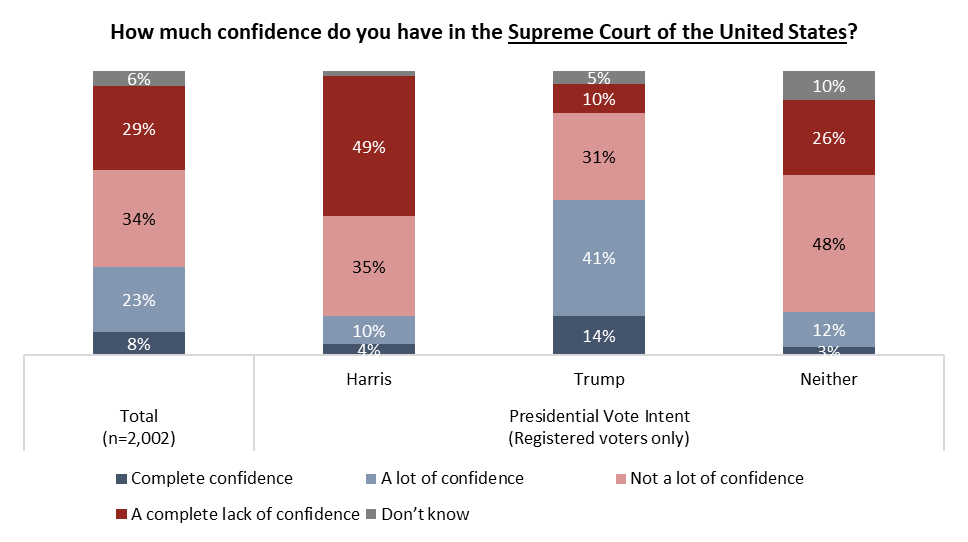 Of the current nine Supreme Court justices, six were nominated by Republicans, including three by former president Donald Trump, who is once again the Republican nominee for president this election cycle. Perhaps it is then unsurprising that those who intend to vote for Trump are much more confident (55%) in the Supreme Court than those who intend to vote for the Democratic nominee, Vice President Kamala Harris (14%). However, confidence among Trump supporters is not universal, with two-in-five (41%) expressing they have “not a lot” or “a complete lack of confidence” in the Supreme Court.