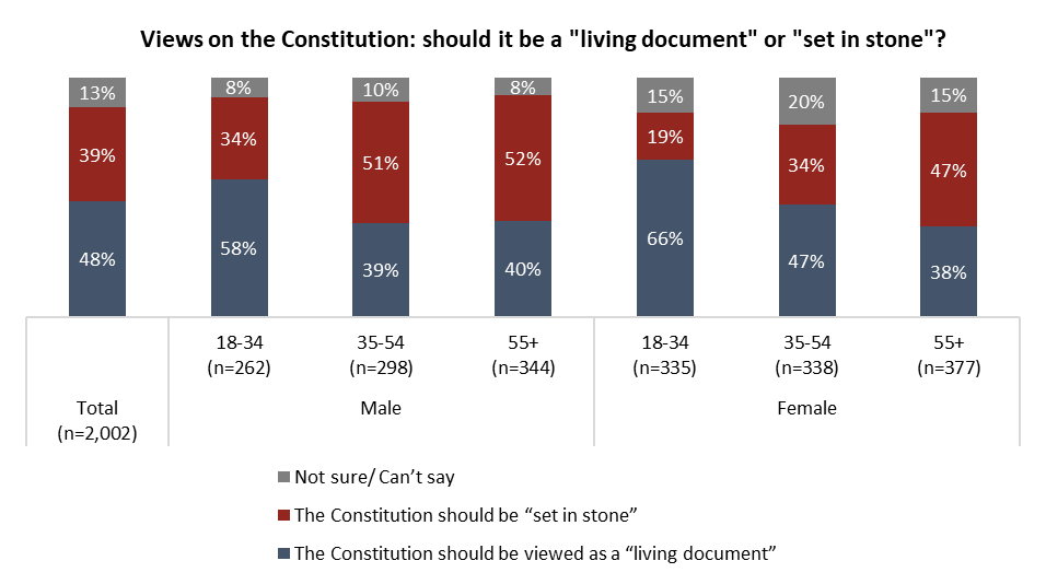 Half (48%) of Americans believe the Constitution should be a “living document” and interpreted and changed based on the standards and realities of modern times. Fewer, but still two-in-five (39%) believe instead the Constitution should only be interpreted exactly as it was written by the founding fathers. Older Americans are more likely than younger ones to believe the Constitution should be “set in stone”: