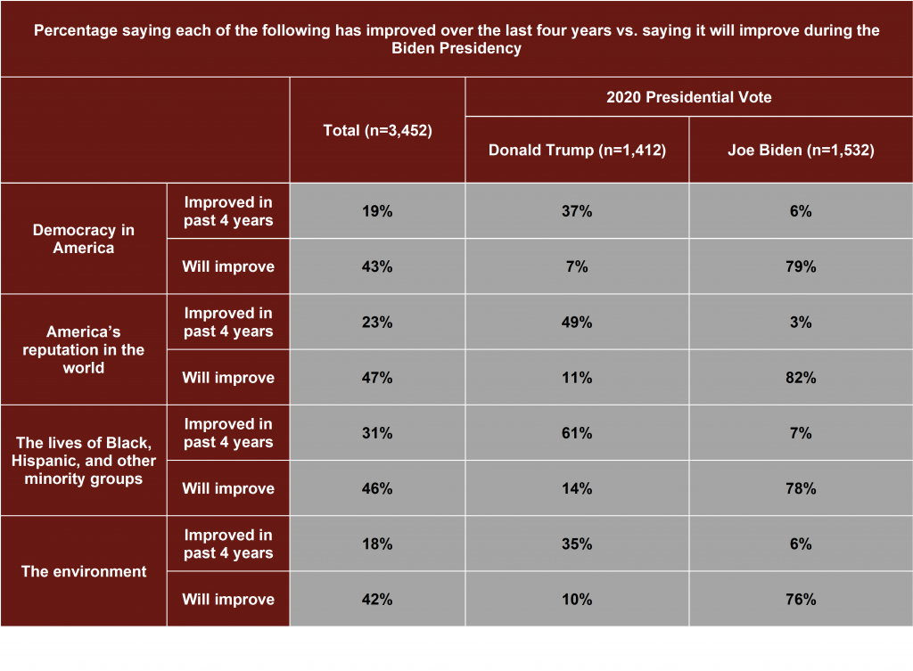 Looking at broader national issues, once again, Trump and Biden voters view the world from not just different places, but different planets. Those who cast a ballot for Trump are six times as likely as Biden supporters to say America’s democracy improved during the past four years, while the latter are eleven times as likely to say this will improve between now and 2024.