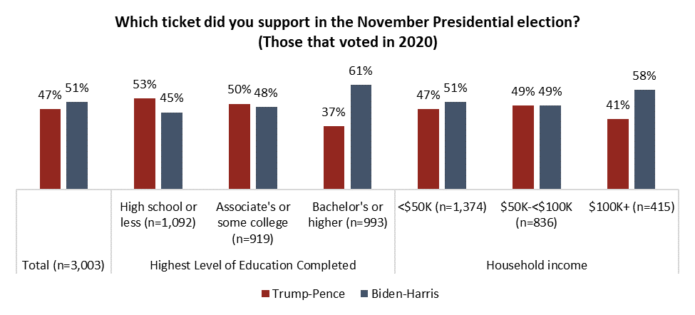 Income and education, too, tell the story. Those earning household incomes of less than $100 thousand annually were equally likely to have voted for either candidate, while Biden won out among higher-income earners. Biden also benefitted from a significant advantage among university educated voters, while Trump won the vote among lower-educated Americans by an eight-point margin: