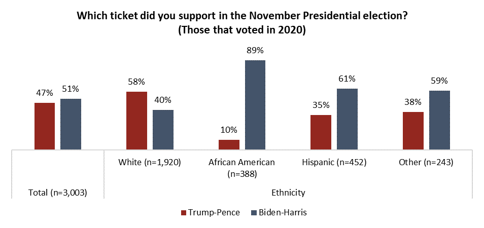 Ethnicity represents another important demographic factor, as Biden garnered support from a strong majority of voters from non-white backgrounds. White voters, however, preferred Trump by nearly a three-to-two margin: