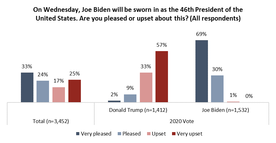 - Overall, 57 per cent of Americans say they are pleased to see Joe Biden sworn in as the 46th President of the United States, while 43 per cent feel the opposite.