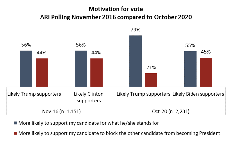 The notable irony in the Democratic Party’s chosen candidate, who was deemed to be a unifying presence in the face of partisan tension across the country, is that Biden supporters’ motivations mirror near-exactly those of Hillary Clinton’s supporters four years ago. The change for Trump is that while his voters wanted to block Clinton in 2016, they largely want to boost him this time around: