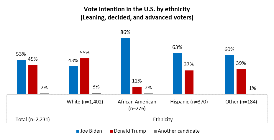 President Trump’s strength continues to be among White voters, where he holds 12-point advantage over Biden (55% to 43%). The rest of the country, however, leans toward the challenger. For Black Americans, support for the former Vice President is near unanimous, while he garners at least 60 per cent of votes among Latinos and other visible minorities: